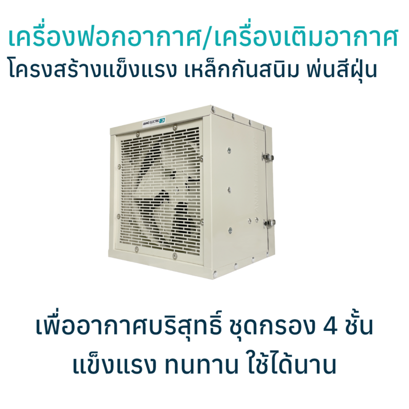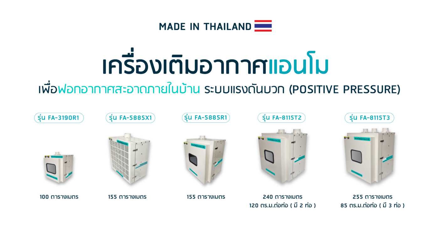 เครื่องเติมอากาศแอนโม เพื่อฟอกอากาศสะอาดภายในบ้าน ระบบแรงดันบวก (Positive pressure) สามารถเติมอากาศสะอาดได้ดี ลดปัญหาโรคภูมิแพ้ แก้ปัญหาฝุ่นละออง PM2.5 ได้ถึง 99.97% เพิ่มออกซิเจน ลดคาร์บอนไดออกไซด์ ตัวเครื่องถูกออกแบบมาให้ติดตั้งและใช้งานง่าย สามารถเปลี่ยน FILTER ได้ด้วยตัวเอง กินไฟน้อย ค่าใช้จ่ายเฉลี่ยวันละ 50 สตางค์ – 3 บาท โดยเปิดประมาณ 8 ชั่วโมงต่อวัน ( ขึ้นอยู่กับความเร็วสปีดที่ใช้ ) ครอบคลุมพื้นที่ได้สูงสุด 255 ตร.ม. เสียงเบาไม่รบกวน ใช้งานได้หลากหลายเช่น ห้องนอน, ห้องทำงาน, ห้องอาหาร, โรงยิม, ฟิตเนส, โรงเรียน, ศูนย์พัฒนาเด็กเล็ก, บ้านพักผู้สูงอายุ และสถานที่ที่ลูกค้าต้องการแก้ปัญหามลภาวะจากภายนอก เพื่อให้ สถานที่ภายในมีอากาศที่สะอาดปลอดฝุ่น และเติมอากาศใหม่เข้ามาภายในอาคารตลอดเวลา แก้ปัญหาอากาศอับชื้น