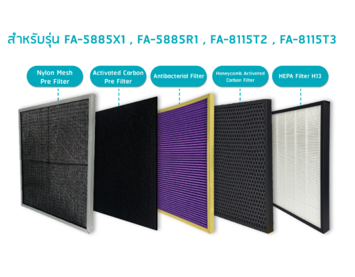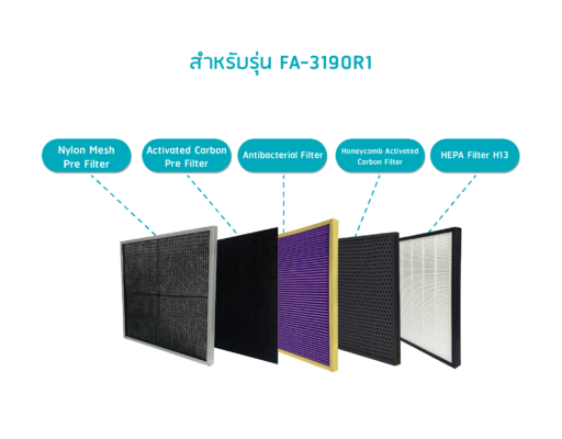 ชั้นที่ 5 HEPA Filter H13 : สามารถดักจับฝุ่นละเอียด PM 2.5 ละอองเกสร เชื้อรา แบคทีเรีย ไรฝุ่น ที่มีขนาดเล็ก 0.3 ไมครอน ได้ถึง 99.97% อายุการใช้งานได้ 2 ปี (ขึ้นอยู่กับสภาพแวดล้อม)