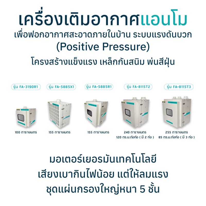 เครื่องเติมอากาศแอนโม เพื่อฟอกอากาศสะอาดภายในบ้าน ระบบแรงดันบวก (Positive pressure) สามารถเติมอากาศสะอาดได้ดี ลดปัญหาโรคภูมิแพ้ แก้ปัญหาฝุ่นละออง PM2.5 ได้ถึง 99.97% เพิ่มออกซิเจน ลดคาร์บอนไดออกไซด์ ตัวเครื่องถูกออกแบบมาให้ติดตั้งและใช้งานง่าย สามารถเปลี่ยน FILTER ได้ด้วยตัวเอง กินไฟน้อย ค่าใช้จ่ายเฉลี่ยวันละ 50 สตางค์ – 3 บาท โดยเปิดประมาณ 8 ชั่วโมงต่อวัน ( ขึ้นอยู่กับความเร็วสปีดที่ใช้ ) ครอบคลุมพื้นที่ได้สูงสุด 255 ตร.ม. เสียงเบาไม่รบกวน ใช้งานได้หลากหลายเช่น ห้องนอน, ห้องทำงาน, ห้องอาหาร, โรงยิม, ฟิตเนส, โรงเรียน, ศูนย์พัฒนาเด็กเล็ก, บ้านพักผู้สูงอายุ และสถานที่ที่ลูกค้าต้องการแก้ปัญหามลภาวะจากภายนอก เพื่อให้ สถานที่ภายในมีอากาศที่สะอาดปลอดฝุ่น และเติมอากาศใหม่เข้ามาภายในอาคารตลอดเวลา แก้ปัญหาอากาศอับชื้น ชุดแผ่นกรองใหญ่หนา 5 ชั้น