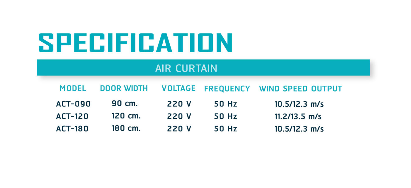 มอเตอร์ออกแบบเฉพาะสำหรับ Air Curtain ใช้ลวดทองแดงคุณภาพสูง  มีระบบตัดไฟอัตโนมัติด้วย Thermal protector และใช้ฉนวน Polyesterสายไฟ มาตรฐาน UL มีความปลอดภัยสูง